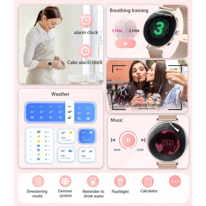 - Remote Camera & Music Control for Extra Convenience:Capture perfect selfies and group shots effortlessly using the remote camera control feature. Play, pause, or switch songs directly from your wrist. This women smartwatch brings entertainment control to your fingertips – ideal for everyday moments and special occasions.Start your day right with intelligent alarms that wake you gently and keep your schedule on track. With real-time weather updates, this ladies smartwatch helps you plan outfits or outdoor activities