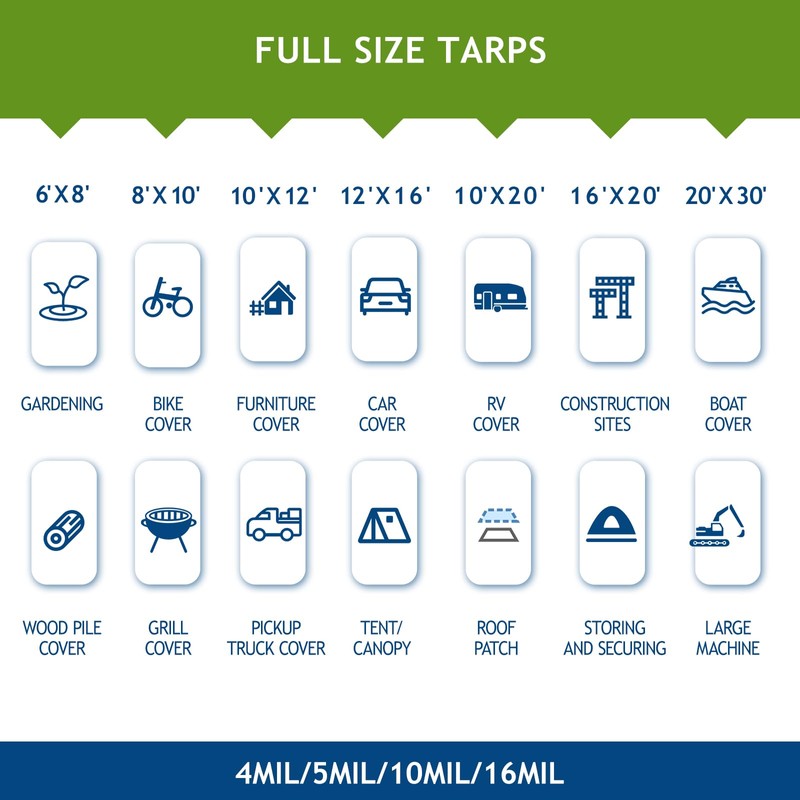 - 【Finished Size】Our versatile tarp comes in sizes ranging from 6 x 8 feet to 20 x 30 feet, with options in various colors and thicknesses to suit your needs. Choose from 5Mil for lightweight, short-term protection; 10Mil for medium-duty tasks and everyday shelter; or 16Mil for heavy-duty construction and long-term use. Perfect for outdoor activities or home projects, the SUNLITAP tarp delivers strength, portability, and exceptional value