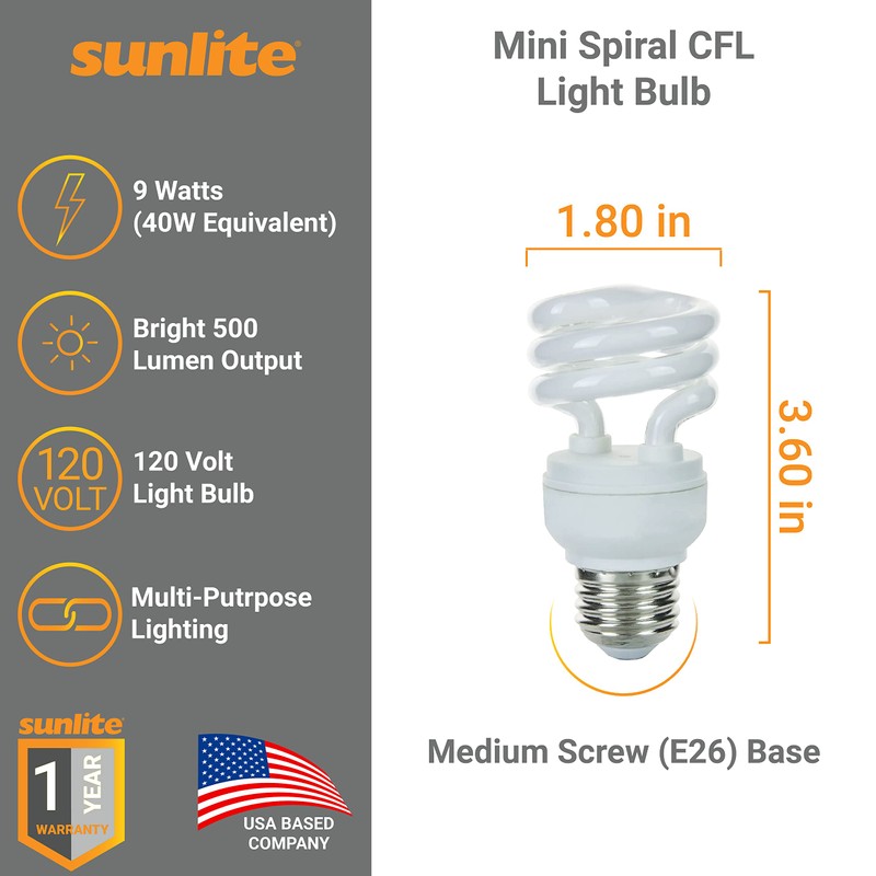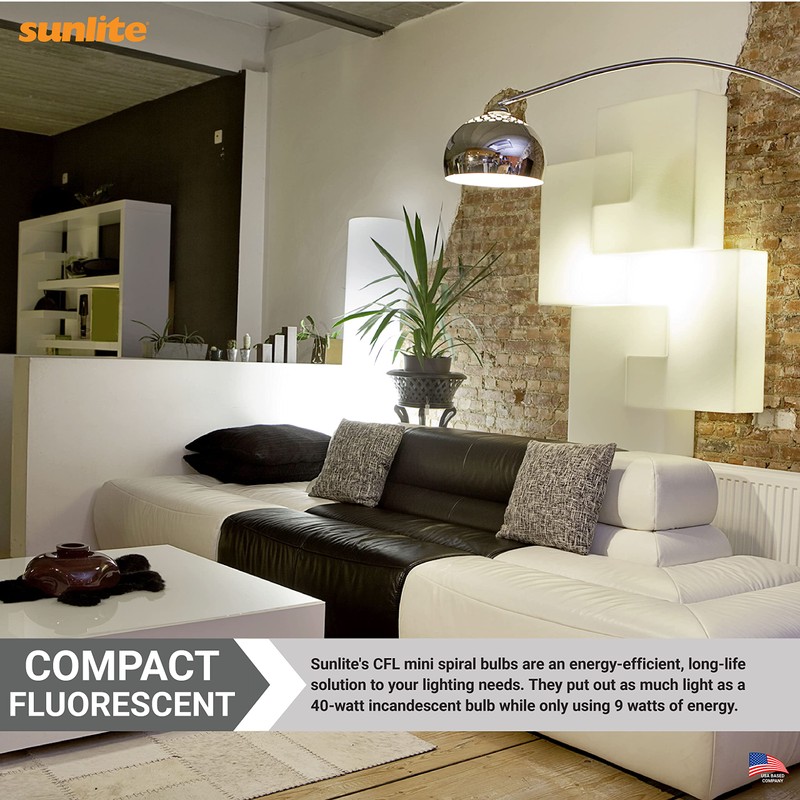 - COMPACT FLUORESCENT - Sunlite CFL Mini Spiral Bulbs are an energy efficient, long life solution to your lighting needs. These compact flourescent bulbs last longer than the standard incandescent and halogen bulbs.