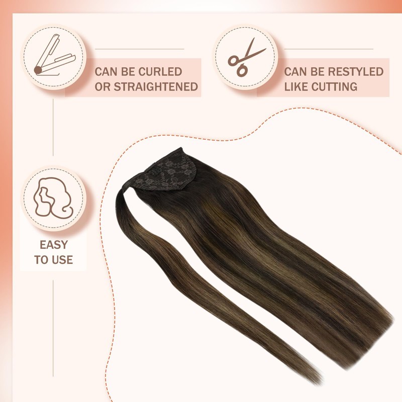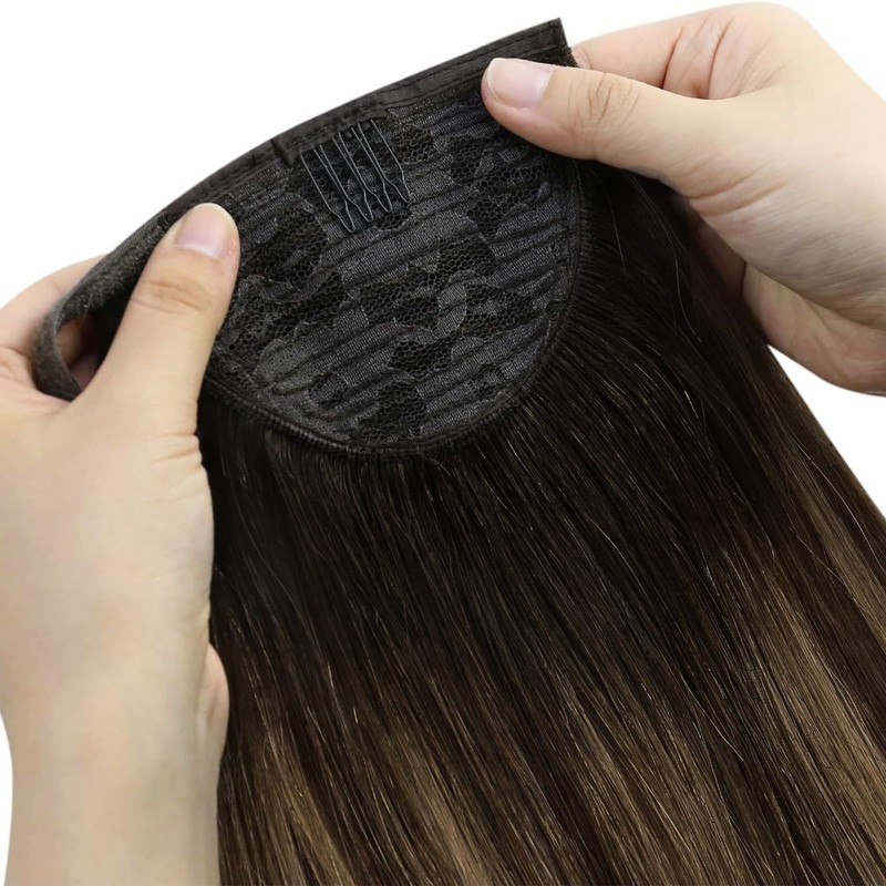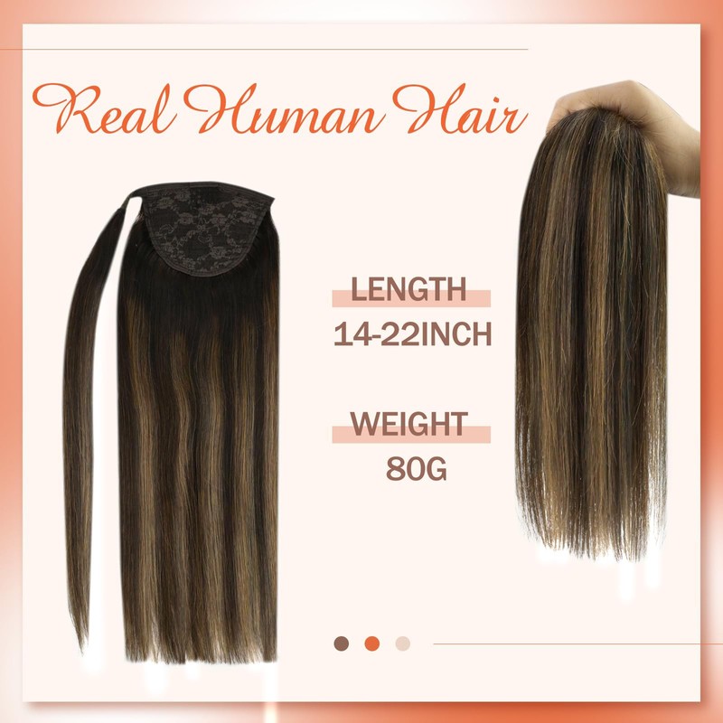 Sunny Hair Ponytail Extension Human Hair Wrap Around Ponytail Extension Straight Pony Tails Hair Extensions Clip in Ponytail Hair Extensions for Women 80G Dark Brown Balayage Medium Brown 20inch