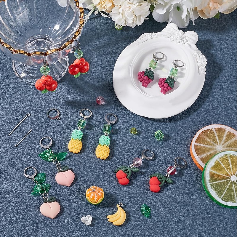 - High Quantity Meterial: Fruit charms are made of resin, leaf charms and imitation pearl bead caps are made of plastic, colorful beads are made of glass, earring findings are made of stainless steel, earring pins and open jump rings are made of brass
