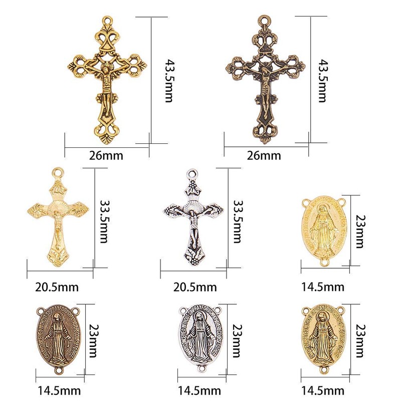 - ❤[SIZE]: chandelier links: 23x14.5x3mm(0.9x0.6x0.1inch), Hole: 1mm; cross pendant: 43.5x26x3mm(1.7x1.02x0.1inch); Hole: 2mm; 33.5x20.5x2.5mm(1.3x0.8x0.09inch), Hole: 2mm; cross pendant and links create a well combination to make rosary bead necklaces.