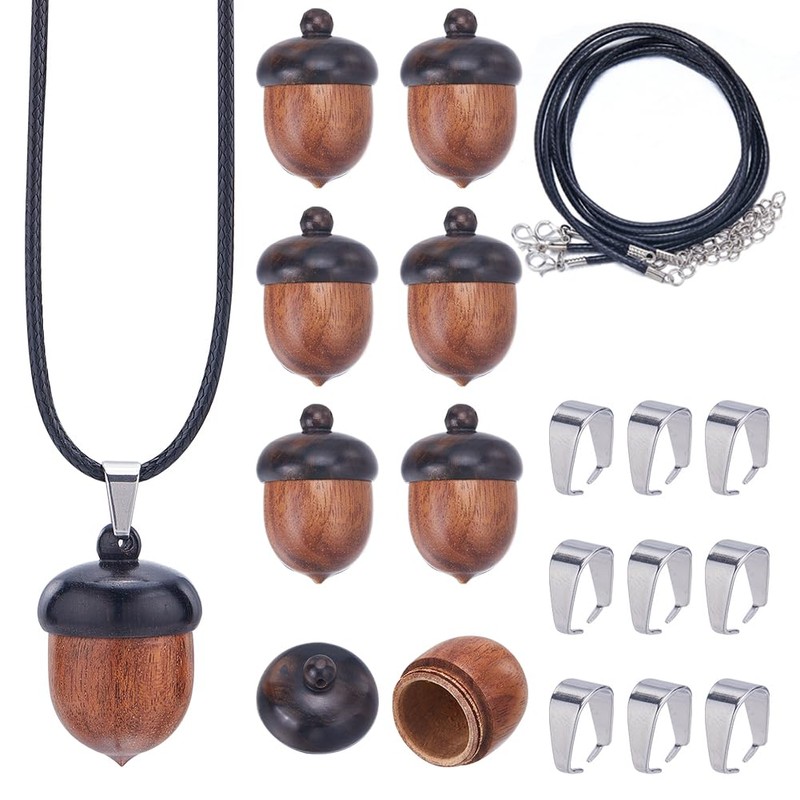 - [18PCS SET NECKLACE MAKING KIT]: 6Pcs wooden acorn charm: 31mm(1.22inch) long, 22mm(0.87inch) in diameter, hole: 1.4mm, 6pcs necklace cord: about 17.72 inch(450mm) long(excluding chain extender), 2mm wide, 6pcs snap on bails: about 10mm(0.39inch) long, 7mm(0.28inch) wide, 5mm(0.2inch) thick.