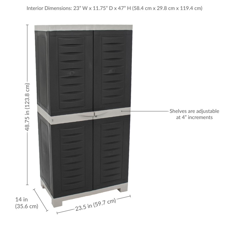 - PROVIDES CONVENIENT STORAGE: The compact size of this heavy-duty plastic garage storage cabinet makes it a convenient storage option for large and small spaces. The cabinet measures 23.5" W x 14" D x 48.75" H overall and weighs 24 lbs. Each shelf measures 21" W x 11.75" D and can be adjusted every 4". Each shelf holds 30 lbs, and the top of the cabinet holds 30 lbs.