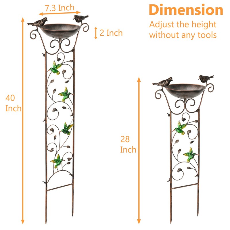 - 【Elegant Design 3 in1】It features 2 decorative metal birds and a bowl as the bird bath at the top can attract birds here to take a bath. 4 bright-colored hummingbirds on the trellis create a conducive environment for climbing flowers. It also can be left unadorned to lend sculptural interest to garden, flower bed or border.