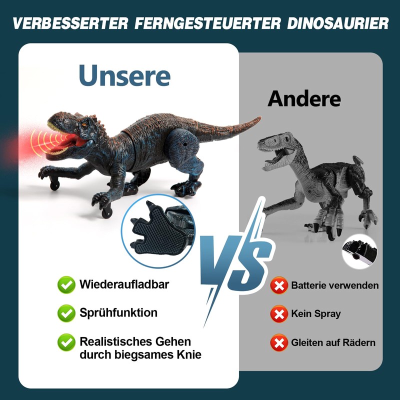 - Super inexpensive, realistic design: this dinosaur toy can go forward/backward, turn right/left with tail tail, open the mouth to spray the water mist with light effect and imitate the wild roar of the dinosaur through the remote control.