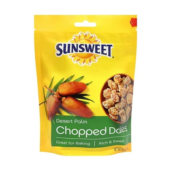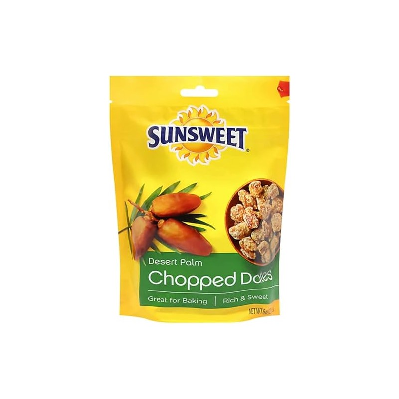 • Sunsweet Chopped Dates. California grown. Rich & sweet. Good source of fiber. Dates are deliciously fat free.