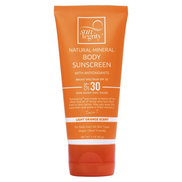 Suntegrity’s SPF 30 Natural Mineral Sunscreen for the body offers broad- spectrum protection and is free of harsh chemicals like parabens, phthalates, propylene glycol, mineral oil, synthetic dyes, sulfates, nanoparticles and chemical UV absorbers. It's non-greasy and contains 20% non-nano, uncoated zinc-oxide for therapeutic broad-spectrum protection against the sun’s harmful UVA and UVB rays. This sunscreen formula is easy to apply, loaded with antioxidants for healthy protection all year round and has a light uplifting citrus scent. TSA Friendly. Made in the USA. - Suntegrity's Natural Mineral Sunscreen for Body made EWG's 2017 "Best Beach & Sport Sunscreens" list and received a #1 Rating in the Skin Deep Cosmetic Safety Database.