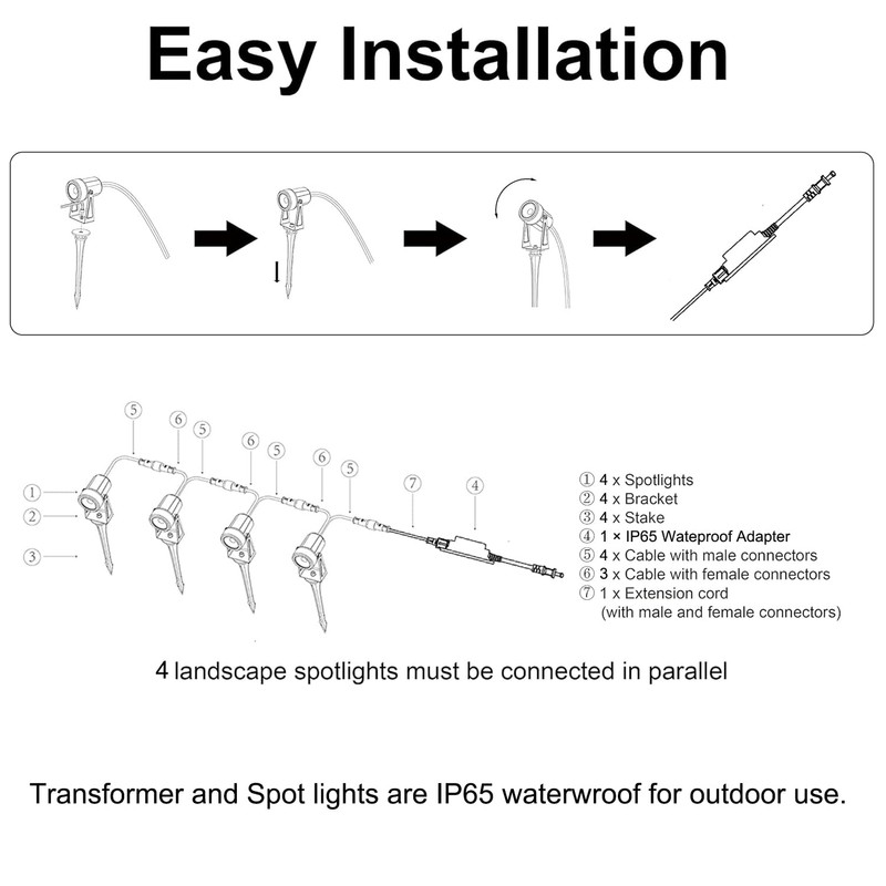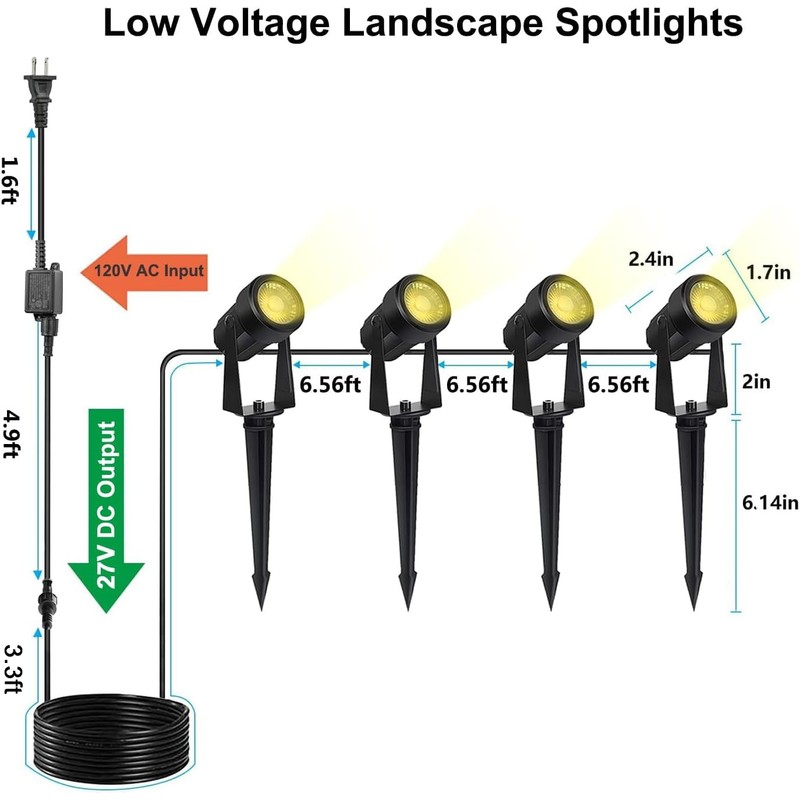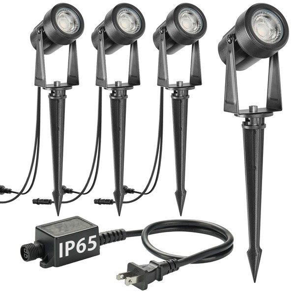 - 【Easy to Install】Wired landscape lighting kits are includes 4 spot lights, 1 transformer and cables for fast and easy set up to brighten your yard. Just stick into the ground or use the included screws to mount on the wall, simple to install, hassle-free to use