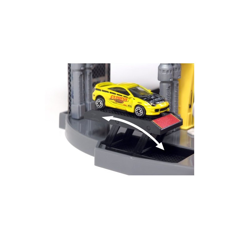 Track n' Town Parking Garage Playset includes 70 total pcs. Five (5) die caste vehicles inclided. Set includes 3-level parking garage with moving elevator and car wash. Works with all 1:64th scale die caste vehicles. Hours of fun.