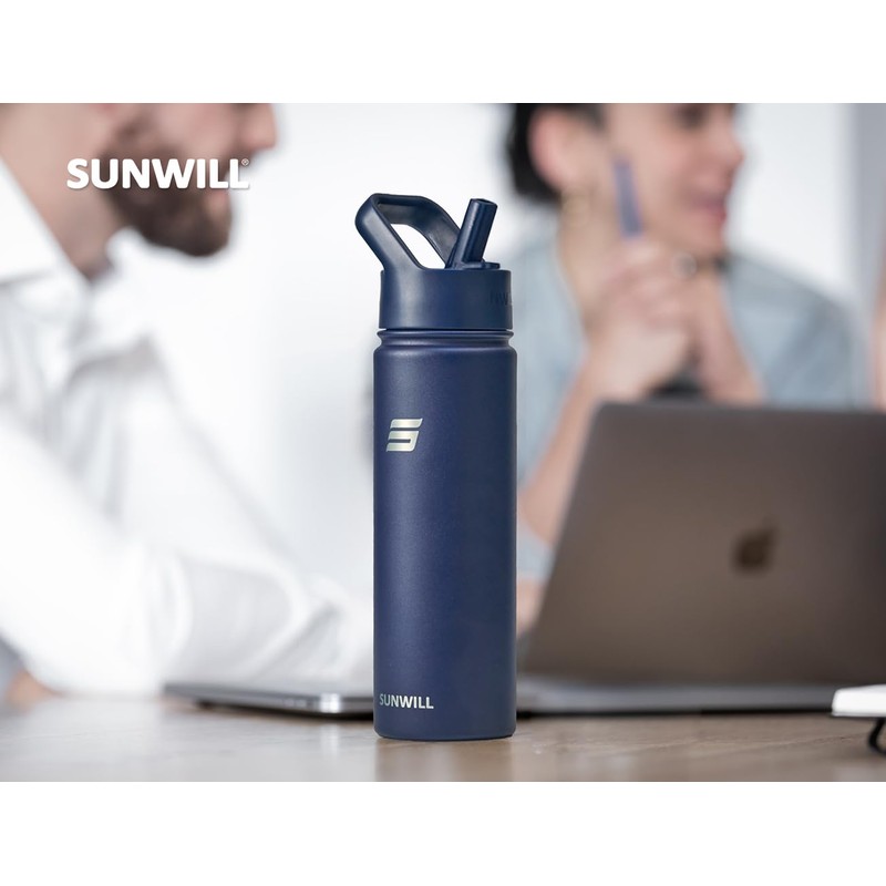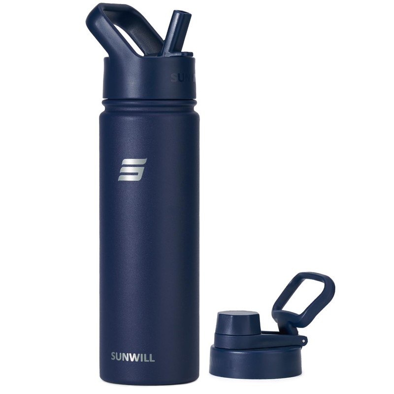 SUNWILL Stainless Steel Water Bottle with Straw, 650ml Insulated Water Bottle Metal, Leakproof Water Flask for Gym & Travel, Navy