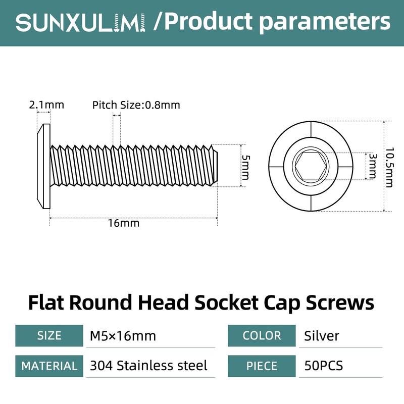 SUNXULIMI M5 x 16mm Flat Round Head Hex Socket Cap Screws Bolts, Furniture Screws, Stainless Steel 304, Bright Finish, Fully Threaded, Metric Allen Hex Drive, 50PCS