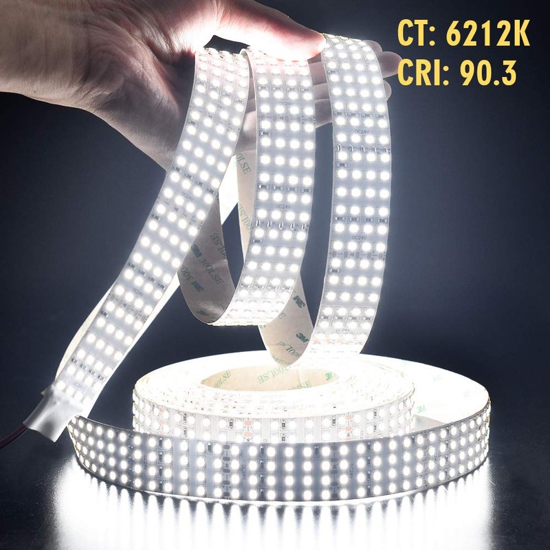 **Product specifications** **LED Strip Type:** Quad row led strip lights **LED Chip:** SMD 2835 480LEDs/m **Light Color:** Daylight White(6212k) **Input Voltage(V):** 24VDC **Working Power:** 9.38Amps 225W /16.4ft Max **CRI (Ra >):** 90.3 **Working Temperature:** -4°F (-20°C) ~ 122°F (50°C) **Dimension:** 16.4ft/roll, Can be cut every 24LEDs 0.2" (50mm) **LED Quantity:** 2400 LEDs /roll , 146 LEDs/ft **Lifespan:** 50,000+hours **Dimensions:** L500cm(197.6 in ) x W2.8cm(1.1 in ) x H0.13cm(0.05 in ) **Lamp Luminous Flux(lm):** Up to 17,655 Lumen/roll **Beam Pattern:** 120 degree **Water Proof:** Non-Waterproof **Applications** Task Lighting LED Cabinet Lighting Showcase Lighting LED Sign Lighting Retail Lighting Videography Lighting Under-Cabinet Lighting LED Workbench Light Trade Show Lighting **Package includes** 1 X 3.28Ft led strips 3 X wire terminals 1 x DC male connector 1 X Product specification 1 X Test report