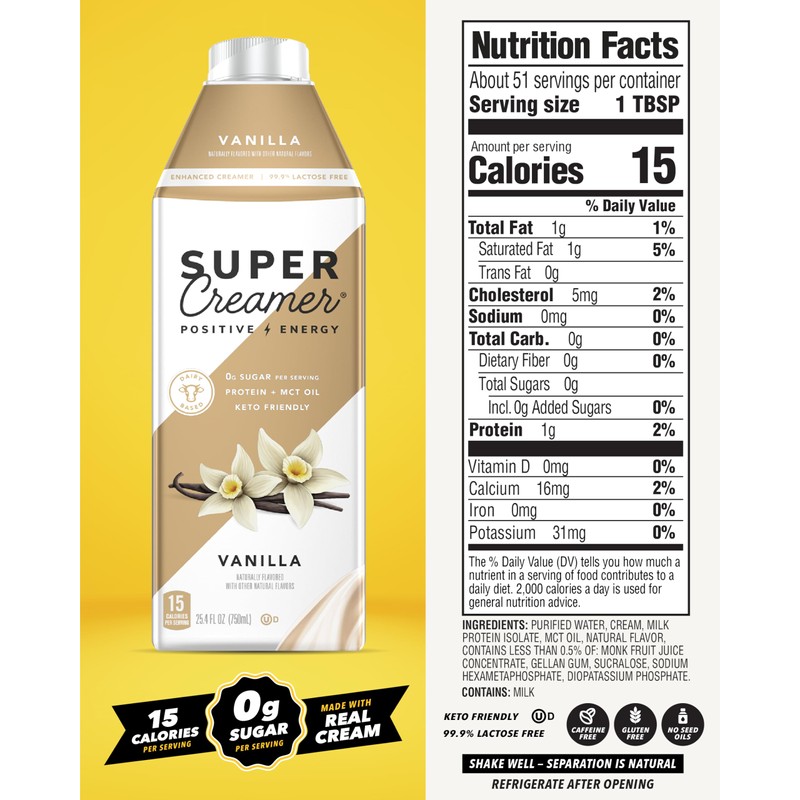 - FUNCTIONAL: You can use our keto coffee creamer in more ways than one. Whether you are adding it to your iced coffee or using it in a baking recipe, Vanilla Super Creamer is your go-to sugar free coffee creamer. Shelf-stable, too!