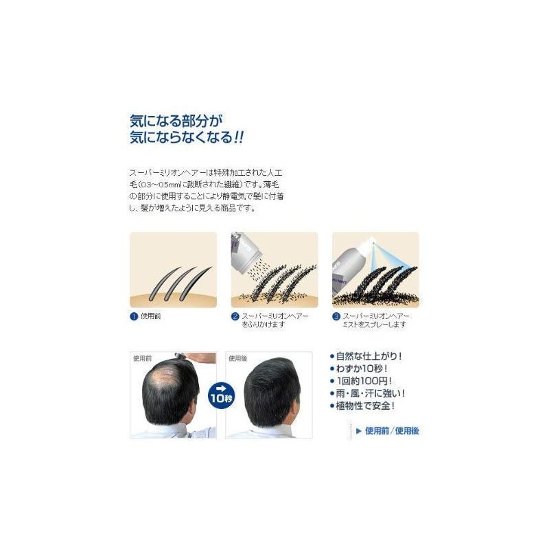 Specially processed synthetic hair (powder) adheres to hair using static electricity. Easy to remove after washing your hair. It is harmless to your skin or hair, and can be used with hair supplements. This is a completely new hair enhancement method that is not a wig or hair growth. Suitable for men and women.