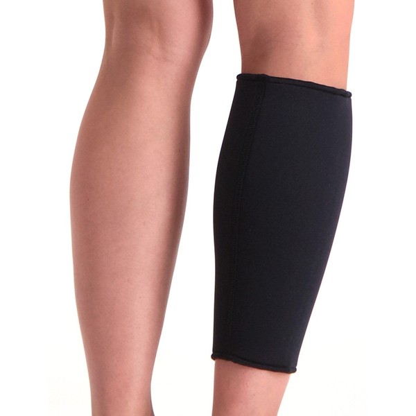 Super Ortho calf bandage in black. The Super Ortho calf bandage provides therapeutic warmth, compression and support for the calf muscles. The extremely comfortable calf support is made from thermal neoprene, a material that holds body heat and stimulates blood circulation. The brace is very suitable for overload, shin splints, muscle strains, or it can be used preventatively against (again) injuries to lower leg, shin, calf. The Super Ortho calf bandage is worn worldwide by many satisfied (high-performance and hobby) athletes. (This bandage is sold singly.) Adjustment: The Super Ortho calf bandage is available in sizes S-XXL. To determine the correct size, please measure the calf circumference where the calf is strongest. (Please do not put it too tight. If in doubt, always choose the larger size according to the size transitions).