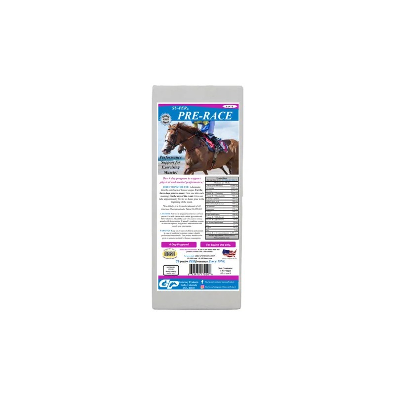 La pasta Super Pre-race es el suplemento ideal para potenciar el rendimiento de los caballos de carreras. Con su fórmula de aminoácidos de alta calidad, esta pasta proporciona a los equinos la energía y resistencia necesarias para alcanzar su máximo desempeño en la pista. Su formato en pasta facilita su administración y asegura una absorción rápida y efectiva. Cada envase contiene 60 mL de producto, suficiente para una dosis completa. Confía en la marca Su-per, reconocida por su compromiso con la salud y bienestar de los caballos. Potencia el rendimiento de tus caballos de carreras con la pasta Super Pre-race.