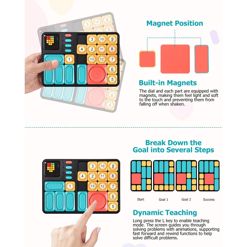 - Thoughtful Sound Effects The magnetic sliding puzzle game console is equipped with built-in speakers, which automatically detect if the puzzle has been successfully solved. A special welcome effect is displayed on the screen, and a victory sound effect sounds from the speakers.