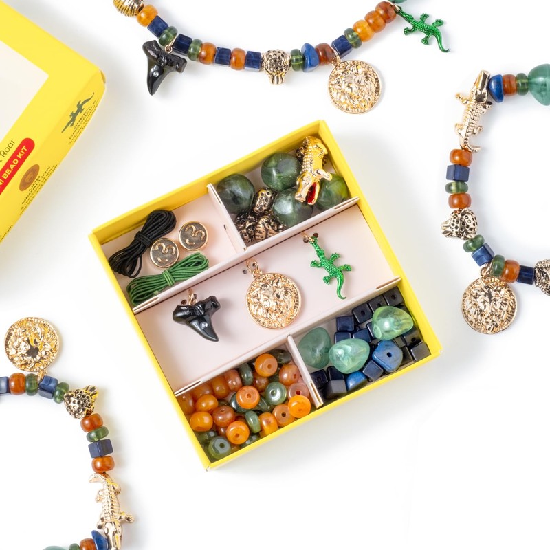 - KIT INCLUDES: Three wild charms (shark tooth, lion medallion, green crocodile), an assortment of jungle-themed beads, and two elastic cords (26" and 10") to make 1 necklace or 2 bracelets