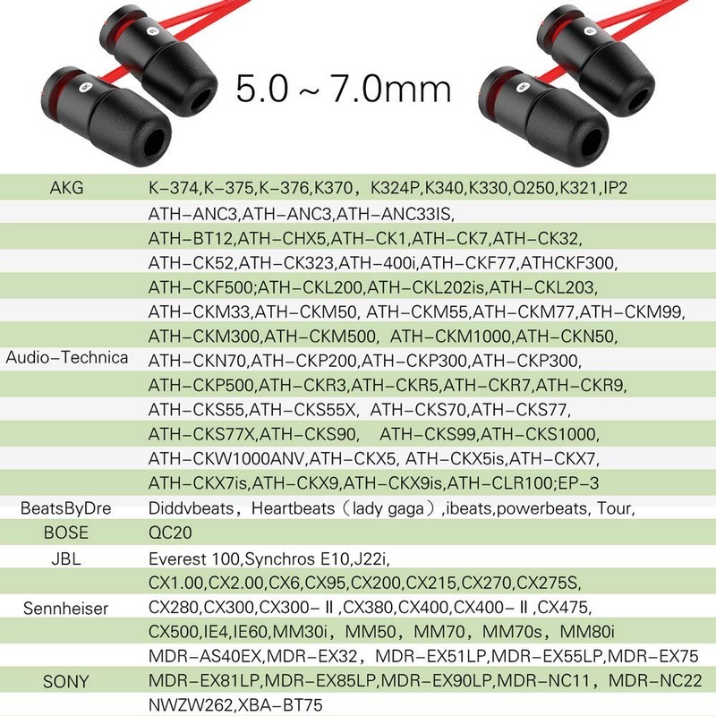 Most earphone nozzles from 5mm-7mm. Note: If unsure your size, the Mixed Pack (includes pair of Small, Medium, and Large tips) will help you to determine the best size. Medium fits 70% of users.