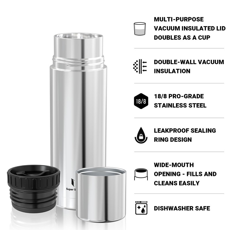 - Dishwasher safe and robust - This vacuum thermos flask is easy to clean. Each part of this stainless steel bottle is dishwasher safe. This durable and robust insulated bottle that you can take in your car, truck, backpack or travel makes your trips more comfortable and stress-free.