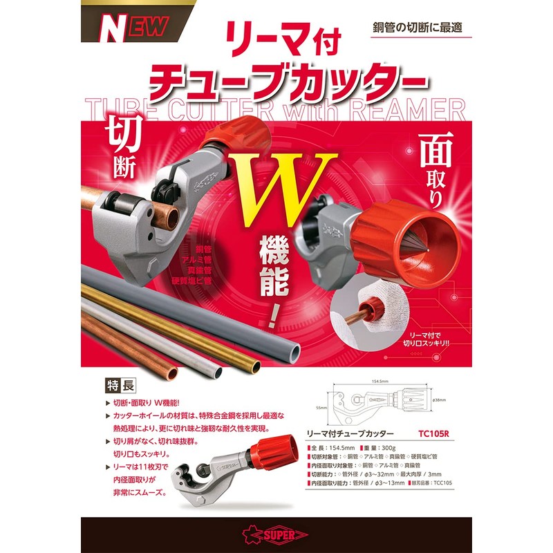 • Manufacturer Name: Super Tool Co., Ltd. Features: The W function of cutting and chamfering, excellent sharpness, and a clean cut. The Reamer has 11 blades and the inner diameter chamfer is very smooth. [Use] For copper tubes, aluminum tubes, brass tubes, and hard PVC tubes. For chamfering inner diameter (copper tubes, aluminum tubes, brass pipes). [Specifications] / Product Name: Super Tube Cutter with Reamer / Model Number: TC105R / Maximum Wall Thickness: 0.1 inches (3 mm) / Total Length: 6.1 inches (154.5 mm) / Compatible Replacement Blades: TCC105 mm / Reamer Inner Diameter Chamfer Capacity: 0.04 - 0.08 inches (3 - 32 mm) / Cutting Capacity (inch): 1 /8 - 1 1/4 (3 - 32) / [Material/Finish] / Body: Aluminum, Blade: Special Steel, Weight: 10.6 oz (300 g) / JAN Code: 4967521431736 /