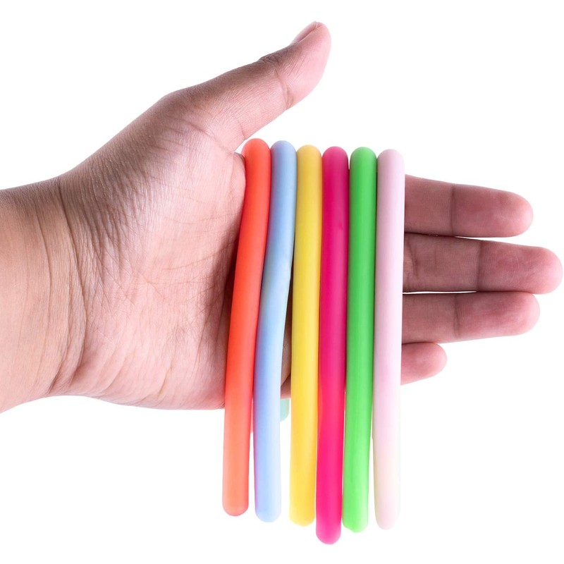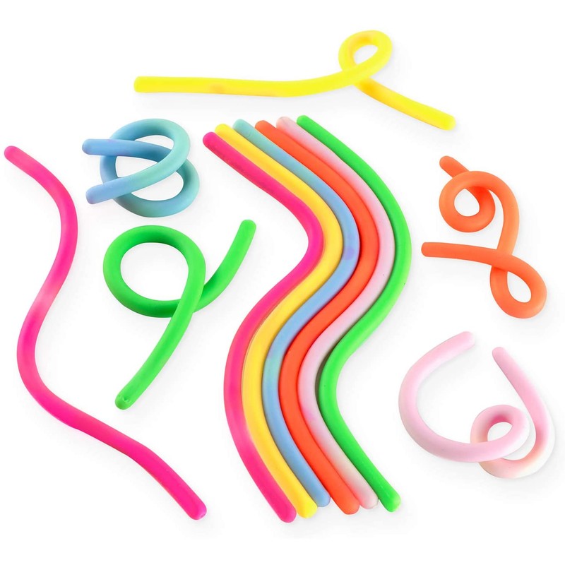 - Each thin jelly string noodle measures 9.5" inches and can stretch to over 5 feet long. Comes in a total of 12 rubber noodle toys, in assorted colors.