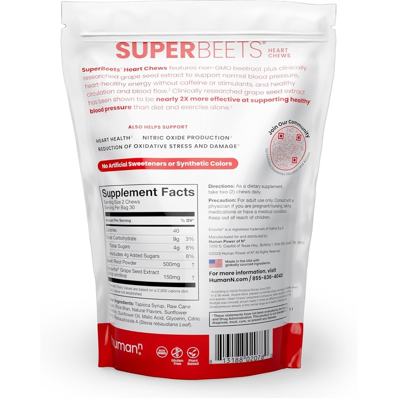 Boost your heart health and energy naturally with SuperBeets Heart Chews! Packed with clinically studied grape seed extract and USA-grown beetroot powder, these delicious pomegranate berry chews support healthy blood pressure and circulation—perfect for busy, on-the-go lifestyles.