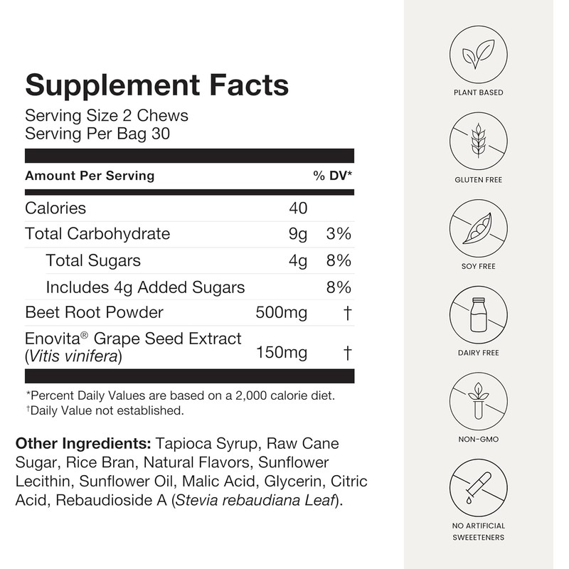 Plant-Based & Non-GMO Formula – Made with non-GMO, plant-based ingredients, these chews combine the power of beetroot powder and polyphenols to naturally support nitric oxide production and heart health.