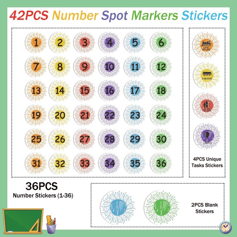 - Number Marker Sticker Set: We design this number markers stickers in sunshine style, includes 36pcs numbers stickers from numbers 1 - 36, 4 pcs unique tasks stickers for door holder,caboose, line leader, lights and 2pcs blank stickers which is writable and erasable, so that's 42 pcs, sufficient quantity to meet your various needs!