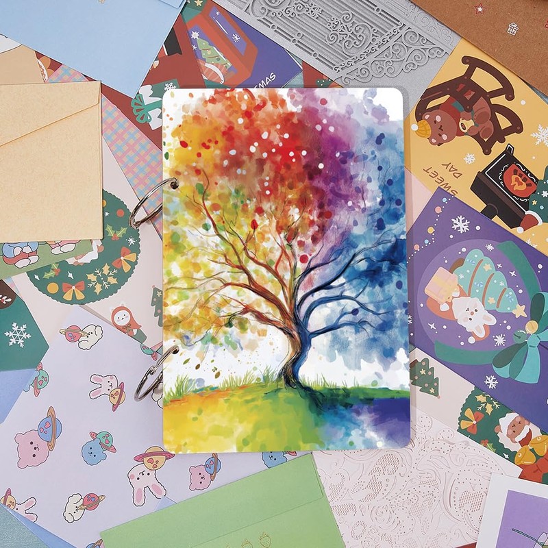 SUPERDANT Tree Greeting Card Holder Seasons Tree of Life Wooden Loose Leaf Binder Postcards Photo Album 2 Rings Cover Keeper Planner Keepsake Gifts for Birthday Christmas Wedding