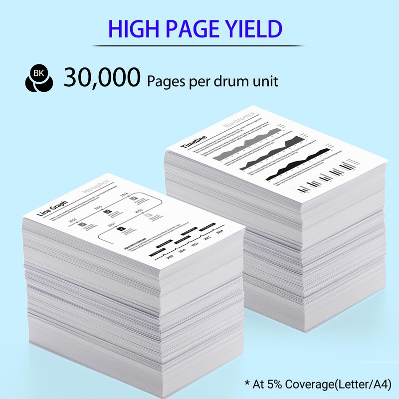 One drum unit can print up to 30,000 pages. (Under condition of 5% coverage in A4 paper).