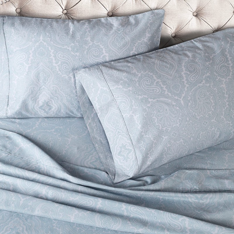 SUPERIOR Cotton Blend Bed Sheet Set, Italian Paisley Design, Includes 1 Fully Elastic Deep Pocket Fitted Sheet, 1 Flat Sheet, 2 Pillowcases, Sateen Weave, Queen, Blue