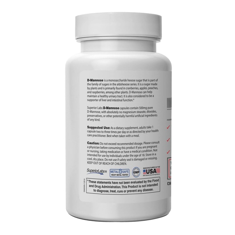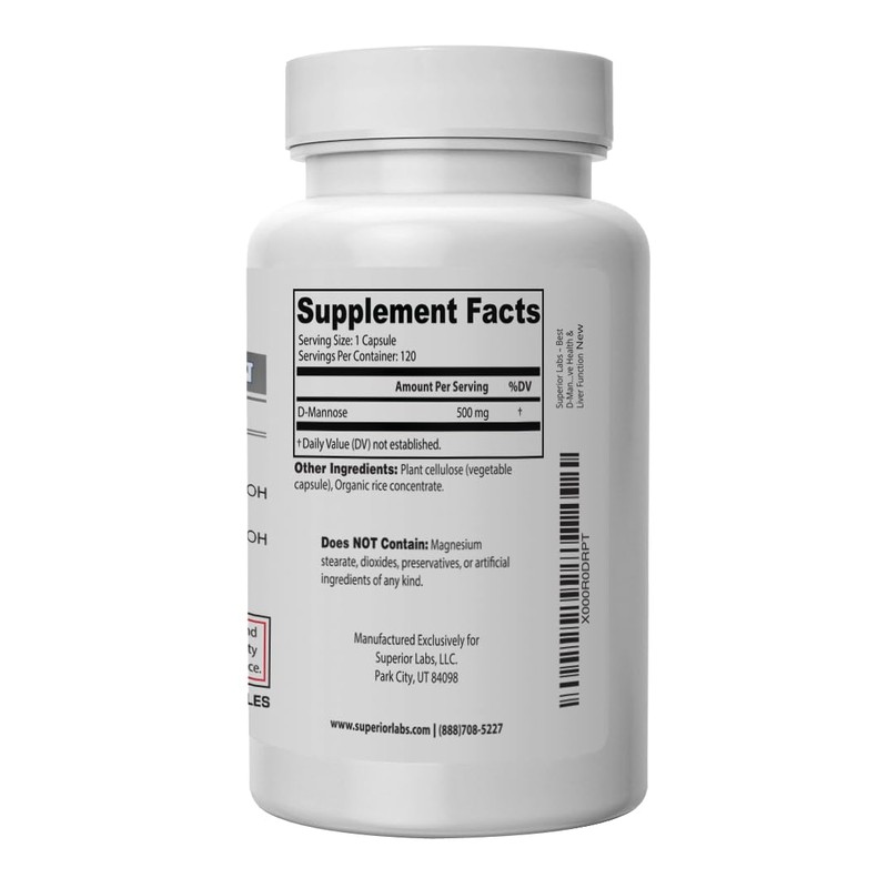 Superior Labs D-Mannose 500 mg, Pure Non-GMO Optimal Absorption Prebiotic, Urinary Tract, Bladder & Kidney UTI Support, Digestive & Liver Health Aid, IC Relief for Women & Men, 120 Veg Caps