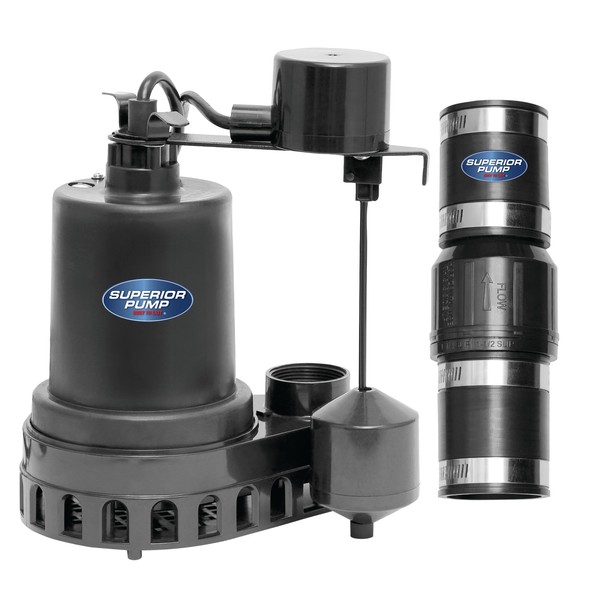 Superior Pump 92057 1/2 HP Thermoplastic Submersible Sump Pump with Vertical Float Switch, plus 1-1/2-Inch Rubber Boot Check Valve