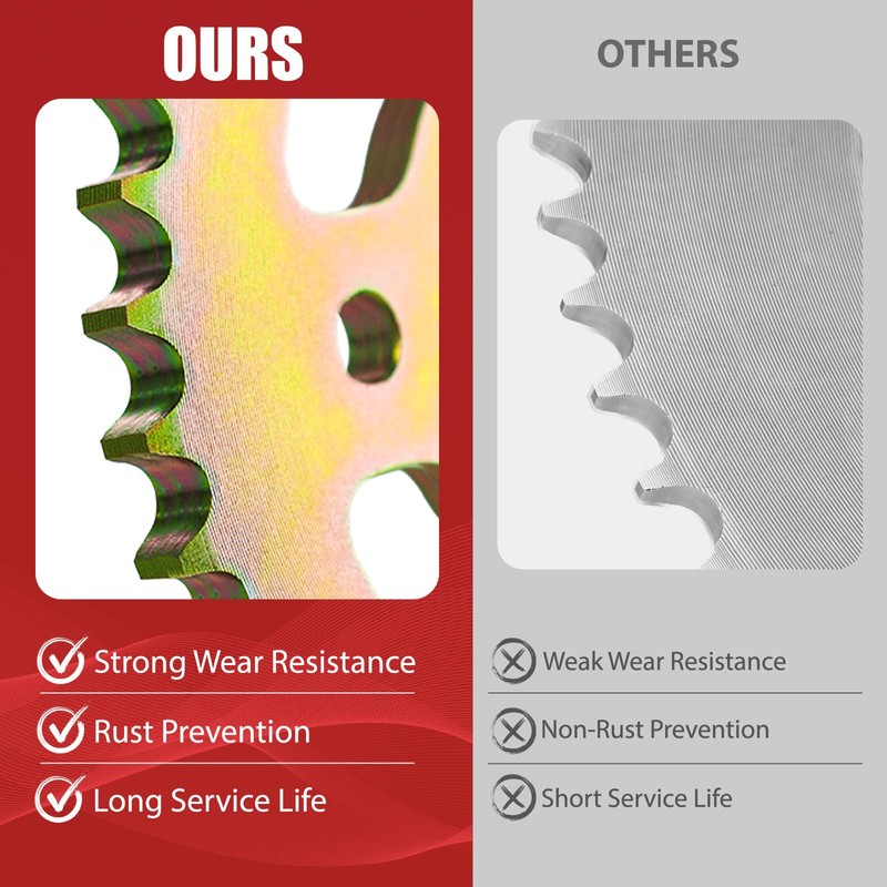 - 【Strong-Performance Improvement】The sprocket for mini bike can provide faster acceleration performance, increase rotational speed, stabilize chain engagement, and prevent chain slippage to cope with different complex terrains such as rough, sandy, and slippery terrain