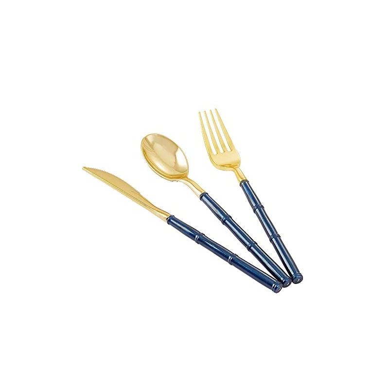 - Unique:Gold plastic silverware is new color with new design,special experience,The unique bamboo handle design, blue glitter looks noble and charming, enhance your party level.
