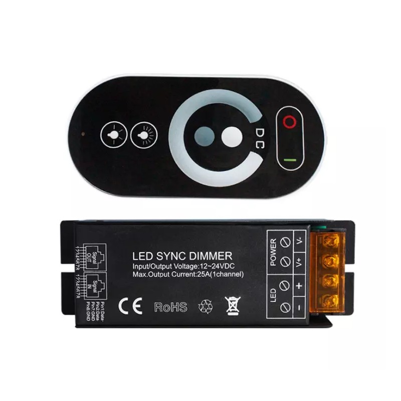 This Single Color RF LED SYNC Dimmer With RF Touch Remote specially designed for the single color LED Light, working in DC12V or DC24V, adopts the most advanced PWM(Pulse Width Modulation) digital dimming technology, designed for the constant voltage single color LED Lights, the LED Sync Dimmer SZ100 with the RJ45 Port for the synchronization function, you can connect many LED Dimmers together and achieve the synchronization function of many LED Lights, comes with the RF Touch Remote, the Remote with 5 buttons and dimming ring, you can use the physical buttons to turn ON/OFF the LED light, adjust the speed of dynamic mode or change the brightness of static color, you also can use the dimming ring to adjust the brightness easily. The RF SYNC LED Dimmer with one output design, the max output current up to 25A.