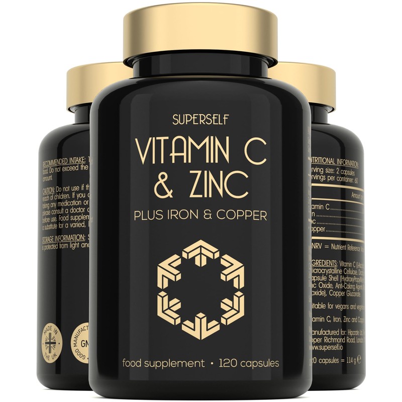 SuperSelf Vitamin C and Zinc Tablets - 1000mg VIT C Enhanced with Zinc, Iron, Copper High Strength - 120 Easy to Swallow Capsules - Vegan Immune System Complex Vitamin C Supplement with Superior Absorption