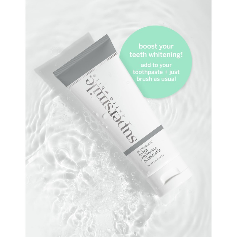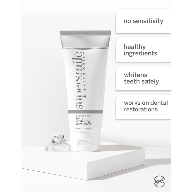 Product DescriptionNeed a powerful boost of tooth whitening power? Supersmile's Extra White Professional Whitening Accelerator is the most advanced, highest concentration formula on the market. When paired with our Professional Whitening Toothpaste, users are clinically proven to receive 2 shades whiter teeth on the first brush and up to 9 shades lighter after 30 days. Developed by Dr. Irwin Smigel, world-renowned "Father of Aesthetic Dentistry", Supersmile is the number one teeth whitening brand recommended by cosmetic dentists. Containing safe, yet potent, whitening agents such as carbamide peroxide, this whitening gel lifts deep set stains and speeds up the whitening process, so you can have a dazzling smile in no time flat. Safe for use on both natural teeth and dental restorations, Supersmile's whitening gel is the best choice when it comes to gently and effectively brightening your smile. Free of silica, parabens, sulfates, known allergens, animal by-products and BPA. Kosher. Made in USA. 3-month supply when used as directed.Brand StoryFounded in 1987 by Dr. Irwin Smigel, supersmile offers a clinically proven collection of premium whitening, breath freshening, and cavity-fighting formulas designed to deliver the utmost in safety and effective oral care.