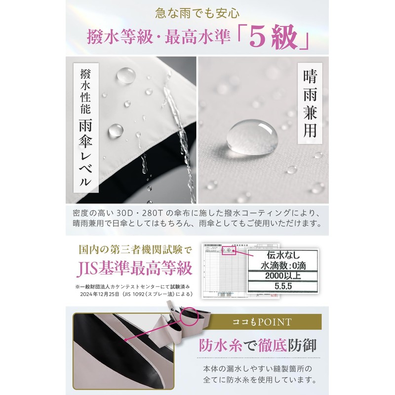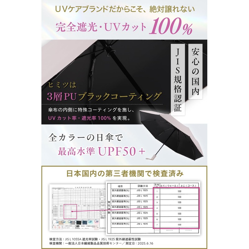• 100% UV Reduction Proven by Japanese Third-Party Inspection Organizations: 100% UV Reduction is verified by Japanese national standards, JIS standard 1925. JIS standard 1055 for 100% light blocking! This is a top quality parasol that completely blocks light