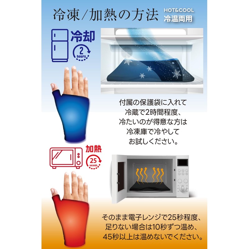 • Freezing Method: Place the sleeve in the bag and freeze for at least 2 hours. When it gets cold, remove it from the bag, put it on your wrist, and put your thumb into the thumb tunnel. Store in the freezer for indefinite life until next use. Heating Method: Take the sleeve out of the bag and heat it in the microwave for 25 seconds to ensure a comfortable temperature If it is not warm enough, please heat it for another 10 seconds. Do not heat for more than 45 seconds. If it gets too hot, please cool it down until it reaches a comfortable temperature. Cooling and hot temperature lasts about 10 to 20 minutes