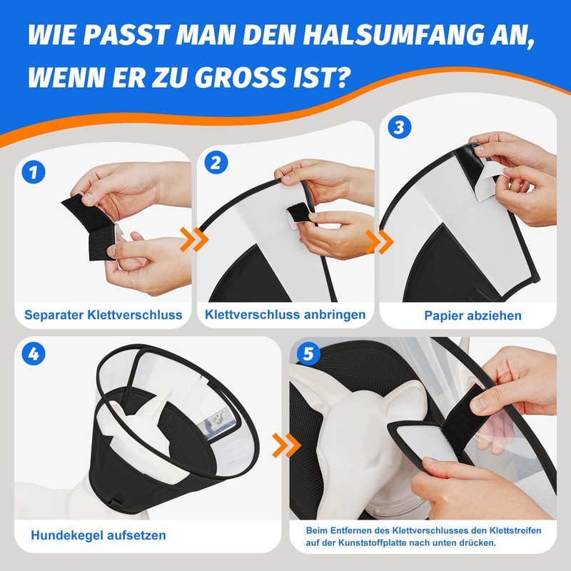 - Warm tips: It is normal that dogs are a little anxious the first time with a cone. Soothe them with treats or toys. Avoid tearing off the Velcro forcibly as this can scare your dog. Instead, adjust the Velcro fastener to the chin before opening it carefully
