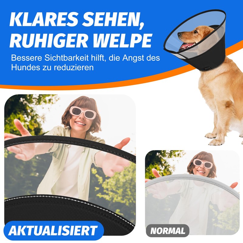 - SOFT AND SAFE Say no to heavy cones of shame. Our dog head cone is made of upgraded lightweight PVC (30% more transparent than standard plastic) for better visibility and less anxiety. Gentle, fabric-coated edges protect against scratches, while the two-layer, breathable neck padding provides comfort. No discomfort from rigid Elizabethan cones - just comfortable, stress-free healing