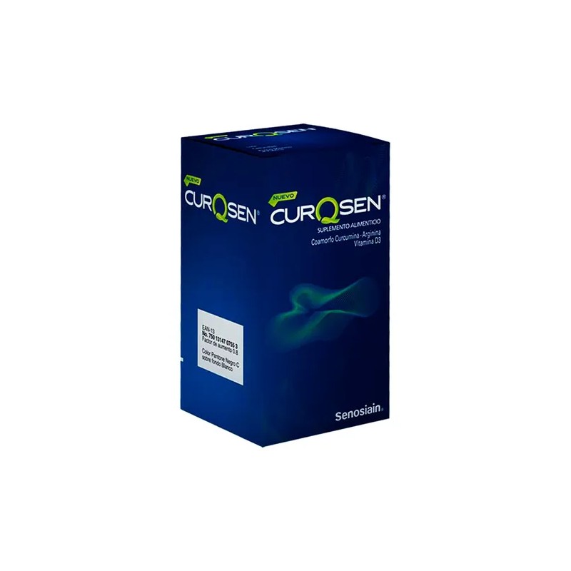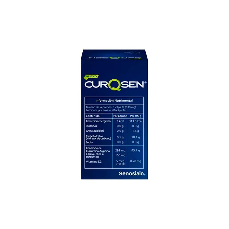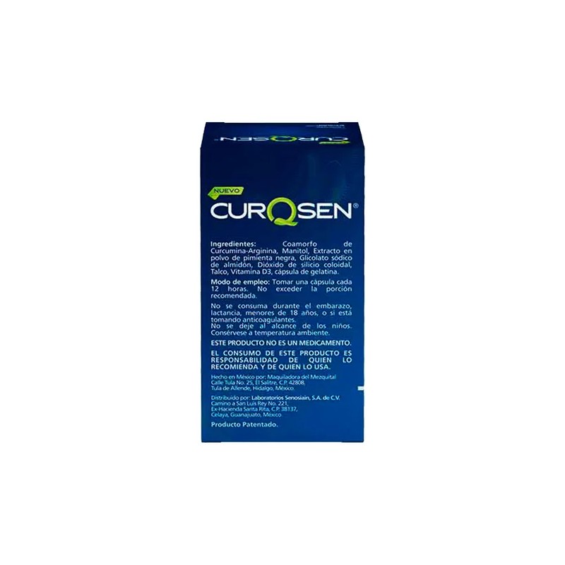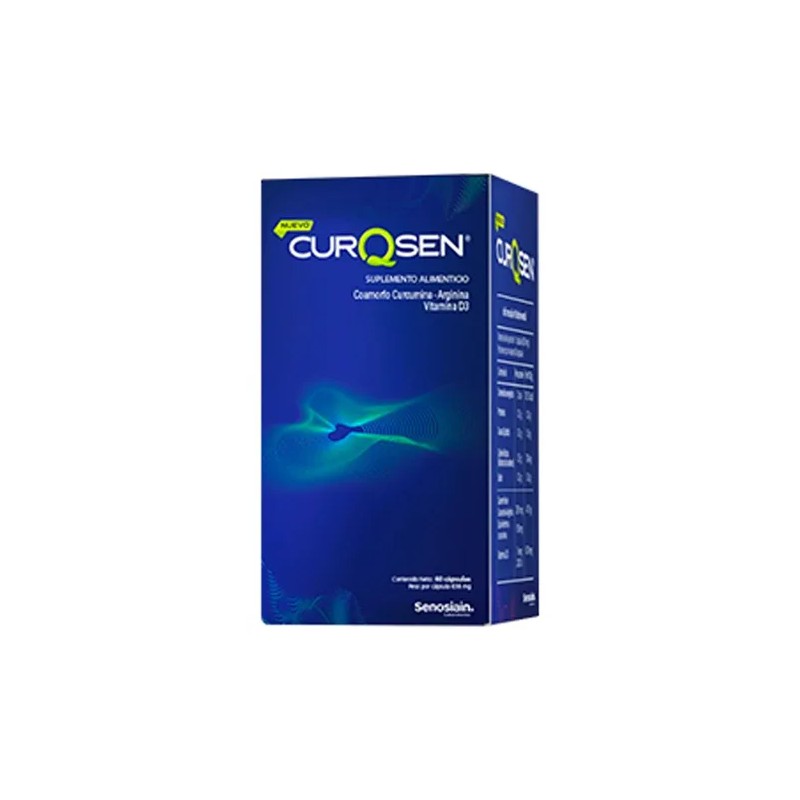 CurQsen es un suplemento alimenticio diseñado para el fortalecimiento del sistema músculo esquelético y para complementar la ingesta diaria de los nutrientes de la fórmula. Se presenta en caja y frasco con 60 cápsulas. Cada cápsula está compuesta por: Vitamina D3, Curcumina-Arginina, Manitol, Pimienta negra.