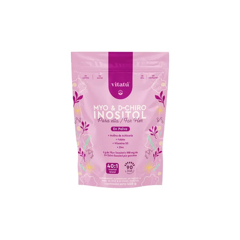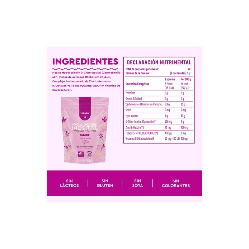 MYO & D CHIRO INOSITOL VITATÚ es un suplemento diseñado para mujeres a base de Myo Inositol, D-Chiro Inositol, Zinc, Folato y Vitamina D3. Relación 40:1 de Myo + D-Chiro Inositol. 4 g Myo Inositol por porción + 100mg D-Chiro Inositol por porción. Muy fácil y práctico de consumir, 2 scoops al día, 1 scoop por la manana & 1 scoop por la noche en agua despues de los alimentos.
