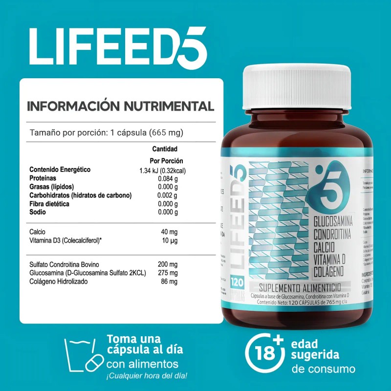 - Las Pastillas para Articulaciones de Lifeed5 representan un avance significativo en el cuidado y soporte de las articulaciones, huesos y cartílagos. Este suplemento alimenticio, enriquecido con una potente mezcla de Glucosamina, Condroitina, Colágeno Hidrolizado, Calcio y Vitamina D, está diseñado para ofrecer un alivio efectivo del dolor articular y promover la salud ósea. Con 120 días de suministro, Lifeed5 Joint Support se presenta como una solución integral para hombres y mujeres que buscan fortalecer sus articulaciones y mejorar su calidad de vida. La fórmula, libre de gluten y azúcar, asegura la máxima calidad y eficacia, utilizando ingredientes de origen natural en sus dosis óptimas permitidas. Ficha Técnica:
