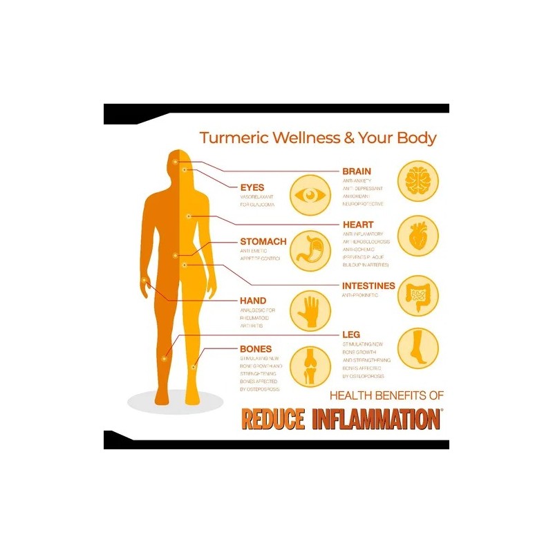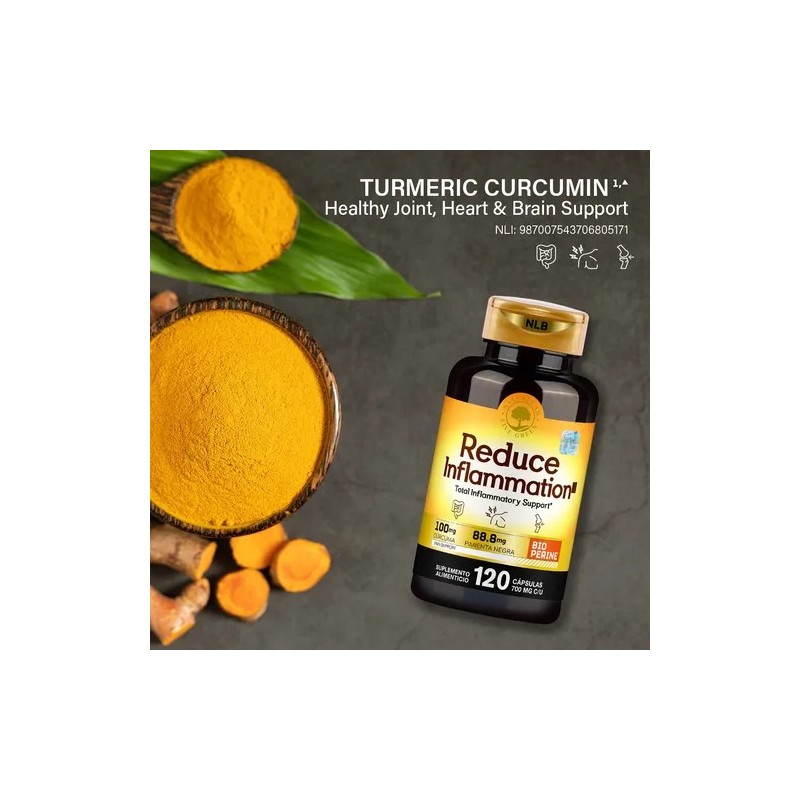 Reduce Inflammation® Su poder antiinflamatorio la convierte es un gran remedio natural para el dolor, los problemas digestivos y el envejecimiento prematuro. La combinación de cúrcuma con extracto concentrado de pimienta negra incrementa la biodisponibilidad y absorción de sus nutrientes y beneficios hasta en un 2000%.