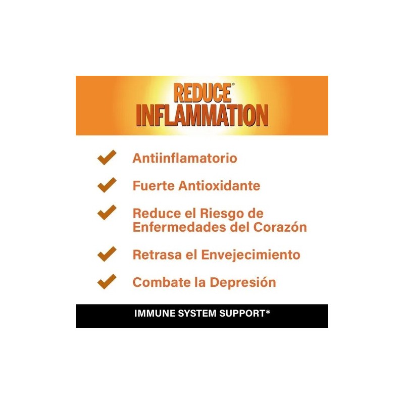 Descripción Limpia: Reduce Inflammation® es una combinación de la cúrcuma y la pimienta negra estos ingredientes juntos presentan un gran contenido en sustancias antioxidantes que protegen nuestras células frente al envejecimiento, pueden mejorar nuestra memoria y ayudar a proteger nuestro organismo frente al deterioro cognitivo.