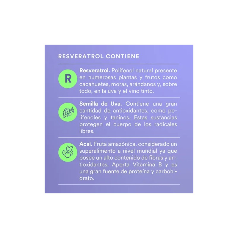 - Ingredientes activos: Resveratrol, Semilla de Uva, Acai